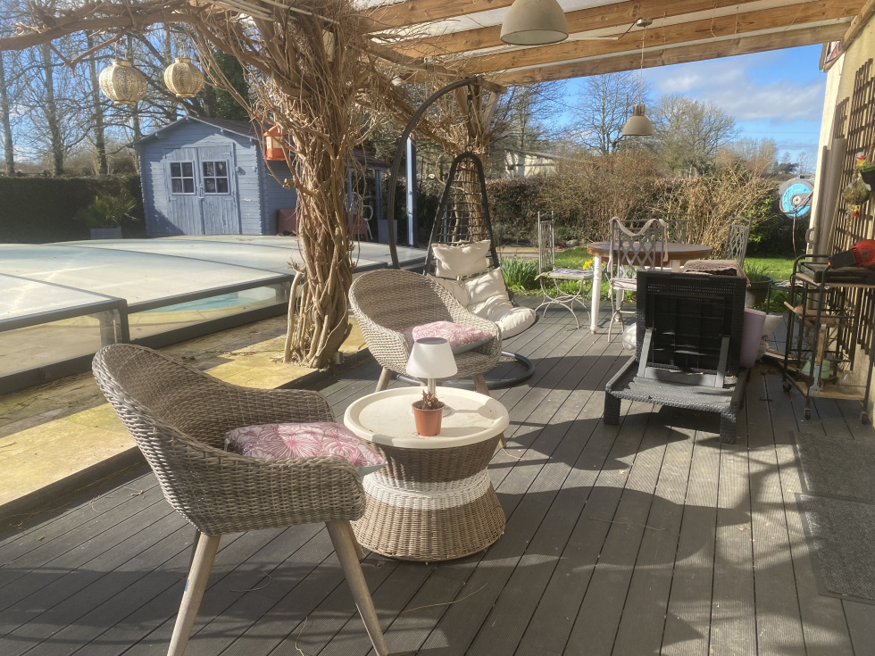 Maison avec piscine couverte Ouest LISIEUX, très bien entretenue refaite avec goût et modernité en campagne sans être isolée. PAC Air/eau. Poêle à Granulés Double vitrage Volets électriques. Garage. 2 chalets. Jardin d'environ 2000 m² clos avec portail automatique. Fibre. Composée de au rdc : une agréable pièce de vie cuisine aménagée et équipée très lumineuse accès direct terrasse en travertin et à la piscine et son bar extérieur. Suite parentale au rdc avec salle de douche récente, jardin d'hiver, entrée, WC. Buanderie chaufferie. L'étage comprend une pièce palière, 2 autres chambres dont une avec lavabo, bureau ou dressing, salle de bains ( balnéo) et douche et WC. 7 minutes en voiture école primaire maternelle et complexe sportif. Les informations sur les risques auxquels ce bien est exposé sont disponibles sur le site Géorisques : www.georisques.gouv.fr