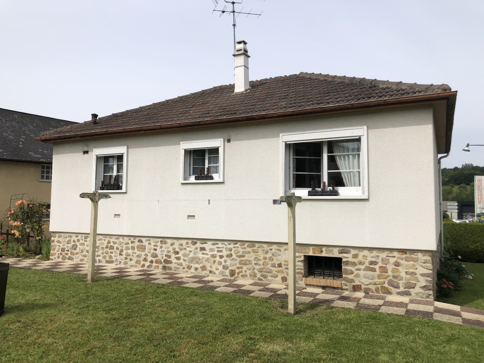 Maison sur sous-sol total comprenant : Entrée, séjour double avec balcon, cuisine aménagée, dégagement avec placards, wc, salle de douche aménagée, 2 chambres avec dressing. Au sous-sol : garage, chaufferie, atelier et pièce chauffée. Le tout sur 450 m² de terrain environ. DPE en cours. Les informations sur les risques auxquels ce bien est exposé sont disponibles sur le site Géorisques : https:// www.georisques.gouv.fr